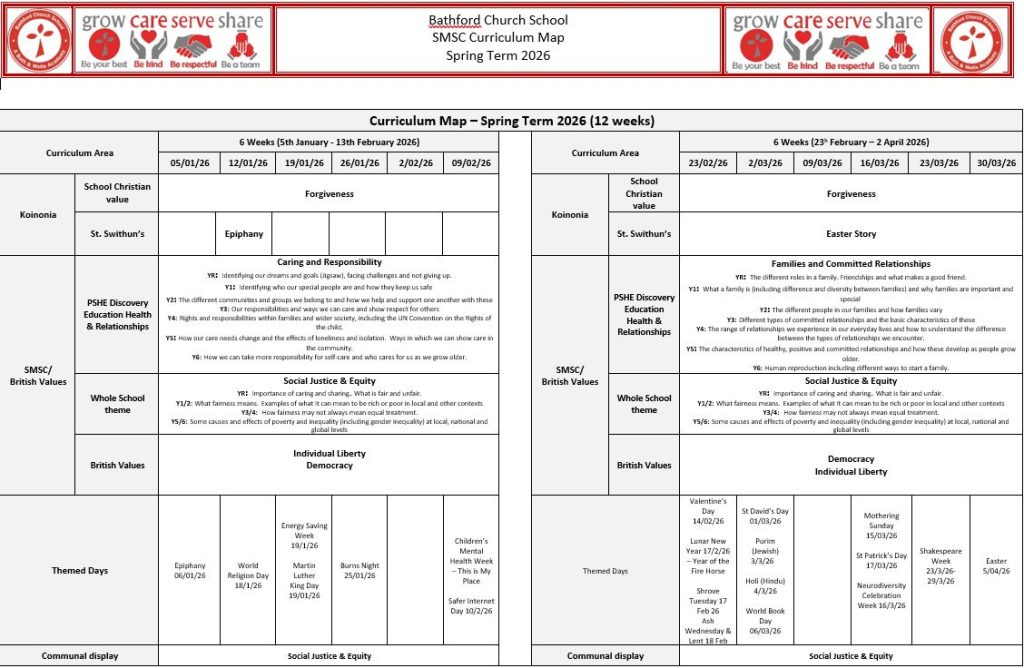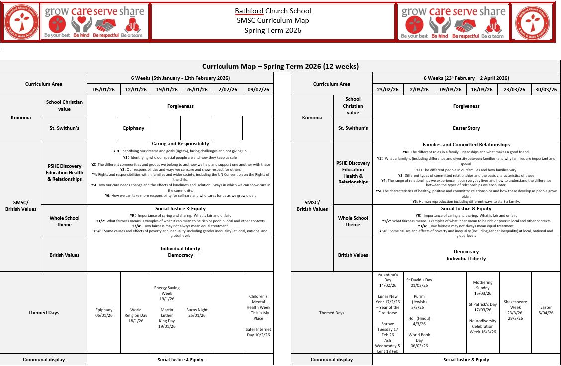 We have an SMSC (Spiritual, Moral, Social, Cultural) map for each big term which shows our Christian value for the term, our whole school theme, and special festivals and days. We use this to plan our termly Koinonia.